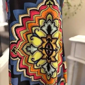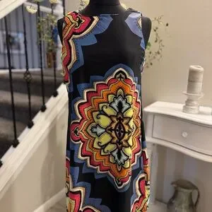 Bold sleeveless midi dress with intricate multicolor patterns. Features a striking design for a standout look! It’s super flattering on and very easy care machine washable.