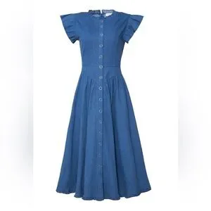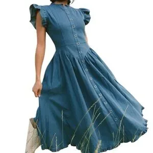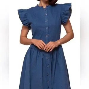 Get ready to turn heads in our Nelly Denim Dress! Made with soft blue denim and featuring a high neckline and flirty flutter sleeves, this midi-length dress is both chic and comfortable. With added details like pockets and a drop basque waist, this button-up style is perfect for any occasion.