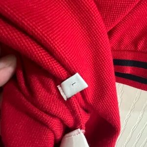 Stylish red polo shirt. Features unique embroidered dog design. Classic button-up collar. Gucci Polo Shirt
