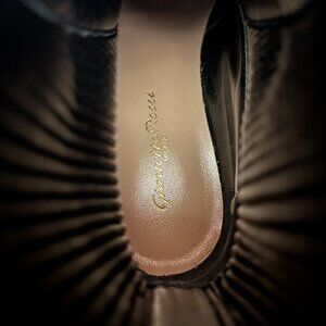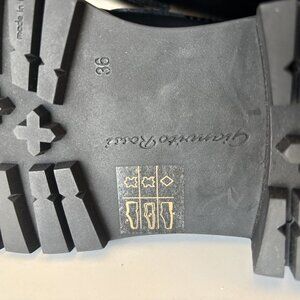 This is a pair of Gianvito Rossi pull on ankle boots with a lug sole in a black color. The upper of these boots is entirely crafted with genuine calf leather, used to create a stretchy sleeve for easy fitting and a beautifully designed exterior. The shoes feature a ribbed texture for the elastic portion, a decorative flap, and intricate seams in the leather, pulling the shoes together sturdily and masterfully, showcasing the expert craftsmanship perfectly. There is a tab to make pulling these on even more convenient, and with an inner lining and insole entirely of genuine leather, you will feel the excellent texture, comfort, and class of these boots as soon as your foot is inside. The lug sole is heavy duty, in amazing condition, and is entirely made of a rubber material to add to the texture and appearance of the boots while also providing resilience against all terrain, weather, seasons, and slipping. These boots have a delicate engraving in the bottom of the exterior sole that indicates they were made in Italy. These shoes are EU 36, US/CA/AU 6, and UK 3. Never worn, but may have been tried for size in store or transported suboptimally. Measurements are available upon request. View all pictures for condition of item. Sizes are converted using provided chart
