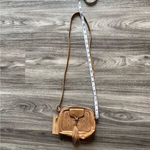 Discover timeless elegance with the Tan Crossbody handbag a compact and practical design, and includes details like a tassel charm and laser-cut patterns on the front flap this bag is your perfect companion for any outing. Please pictures for measurements. Ask if questions:)