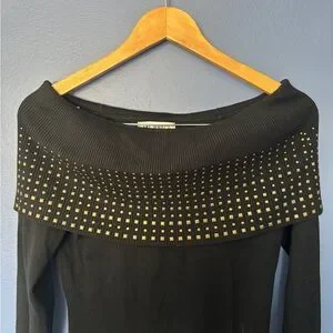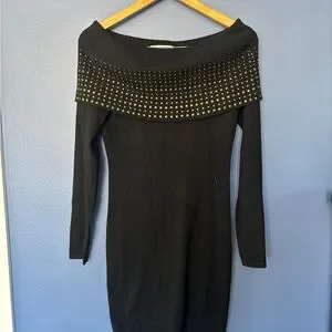 Chic black dress with long sleeves. Features a studded off-shoulder design. Perfect for stylish outings.