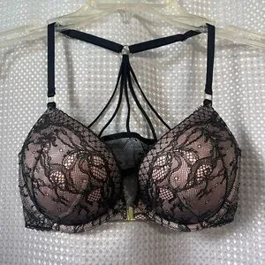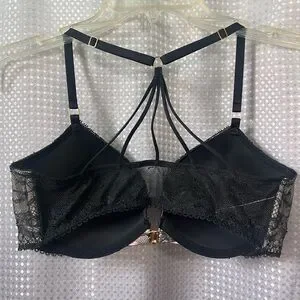 Black & pink push-up padded Victoria’s Secret bra. Racer back style and claps in front.