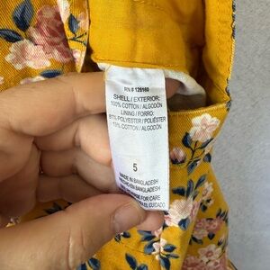 No brand tag kids size 5 overall dress. Good condition and fits true to size. Shell: 100% cotton, lining: 81% polyester and 19% cotton material. Yellow color with pink floral pattern.