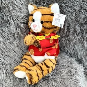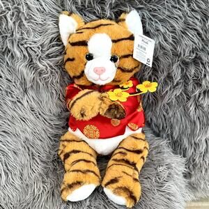Lunar New Year plush by Walmart Year of the Cat 2022 stuffed animal. Orange tiger striped kitty wearing an oriental inspired reg and gold jacket and holding some yellow cherry blossoms. Glistening fur and gold, sparkly eyes with a pink nose and mouth. He will bring you great luck in any year! Adorable!