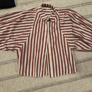 Chic Pilcro shirt with red and white stripes. Features a classic collar and button-up design. Purchased at Anthropologie such a fun flattering shape.