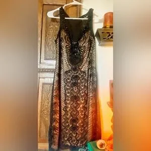 In excellent pre-owned condition. This gorgeous beaded cocktail dress is intricately detailed and the perfect pick for holiday parties! Dress is a size 8 and is 39 inches in length.