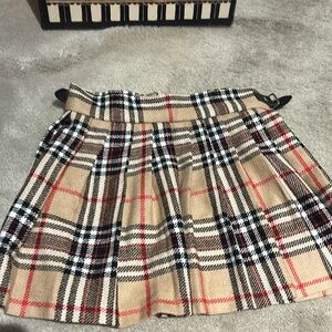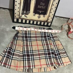 Toddler plaid skirt measures approximately 10 1/2 inches across the waist and approximately 11 inches from the waist to the hem. No tag so I will list as medium ask for further measurements if interested. There are two adjustable belt fasteners at the waist.