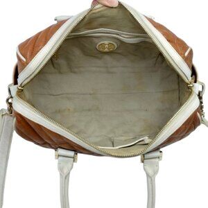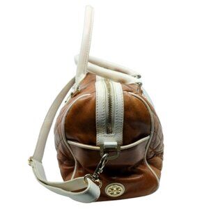 This is a Tory Burch Quilted Leather Bowling Bag in TAN & IVORY