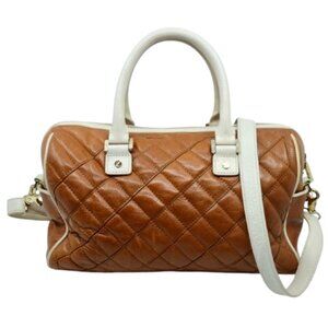 Elegant quilted design. Rich brown leather. Cream accents and handles. Perfect for any occasion.