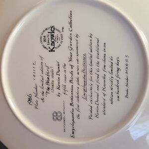 This beautiful plate, The Bluebird, is the fifth in the Encyclopedia Britannica Birds of Your Garden Collection. This plate captures two beautiful bluebirds on a flowering tree branch. The bluebird is a symbol of joy and hope and is believed that good news is arriving shortly. The plate is in excellent condition. The diameter of the plate is approximately 8.5 inches and is made of porcelain. This product is not intended for eating purposes.