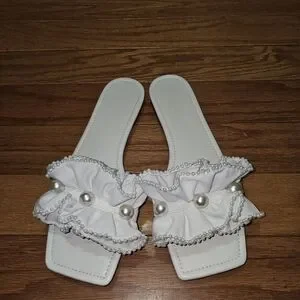 Elegant white slide sandals featuring ruffled details and pearl accents. Perfect for a chic look.