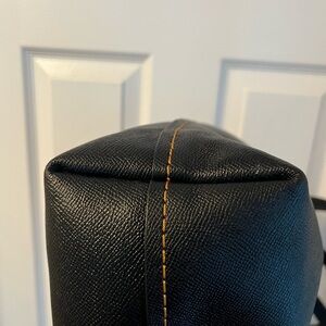 Sleek black tote by Coach. Features durable leather and ample space. This item is in excellent condition and was barely used.