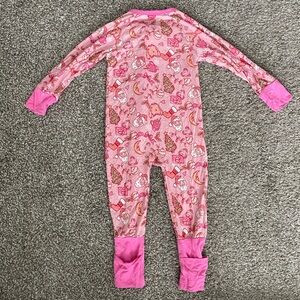 Delightful pink footie pajamas featuring playful patterns. Ideal for cozy nights and fun days. Limited addition Bre Sheppard. Excellent condition, no flaws.
