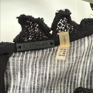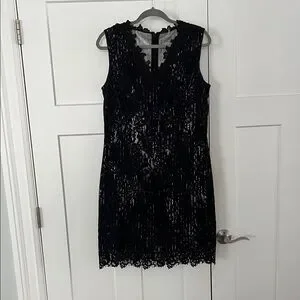 Chic black mini dress with lace. Sleeveless design with a V-neckline. Perfect for evening events or brunch/ showers.