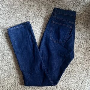 Chic straight leg jeans. Dark blue hue. Versatile and stylish.