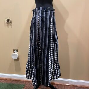 New with tags Wednesday Addams Nevermore Academy skirt with black and gray stripes, black, gray, and white checker print, a faux leather buckle at the waist to adjust size, and “Nevermore Academy” embroidered at the waist. Perfect for cosplay or everyday wear. This brand runs small and thrift marked an XL, the waist is 14-15 inches when laid flat. Love it but I had to get a bigger size.