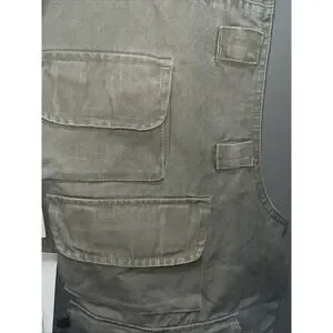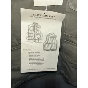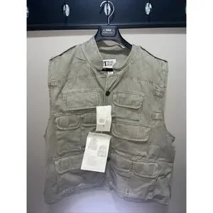 NOS The Trail Designs TV-800 Fishing Sport Hunting Photography Vest is a vintage men's XL vest made of cotton canvas with a stand-up collar. It features a solid green color with pockets for added convenience. This versatile vest is suitable for casual occasions and various outdoor activities like photography, hunting, and fishing. The relaxed fit and mid-length design make it perfect for layering in all seasons. Easy to care for with machine washable instructions, this vest is a practical and stylish choice for the outdoorsman.