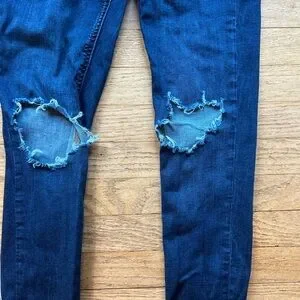 Trendy dark blue skinny jeans with stylish distressing. Perfect for casual wear.