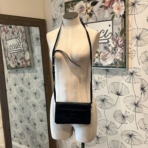 Chic Marc Jacobs crossbody in pebbled black leather. Features a sleek design with a front pocket and adjustable strap.