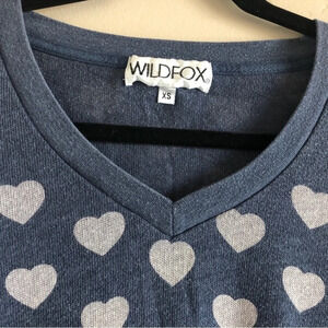 Wildfox Little Hearts V-neck light weight sweater, navy with cream colored hearts, 21” PTP 22.5 length, 49% cotton 49% poly 2% Lycra, excellent condition, smoke free home