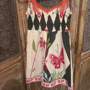 Make a statement in this whimsical butterfly sundress! Featuring bold colors, playful prints, and unique crochet details, this piece is perfect for warm weather, festivals, or casual outings. This dress is not lines. It is like a shift sundress. Very Lightweight.