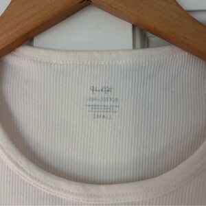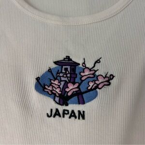 White tank top featuring Japan embroidery. Sleeveless and casual style.