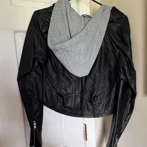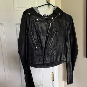 Sleek black leather jacket with silver zippers. Features a classic biker style. Perfect for edgy looks.