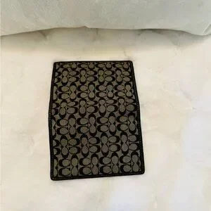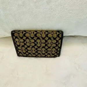 Stylish Coach wallet with signature pattern. Black and gold design. Compact and elegant.