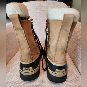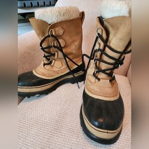 Sorel Mens Caribou winter boots in tan and black size 8. Some staining as shown in photos. Moderate wear.