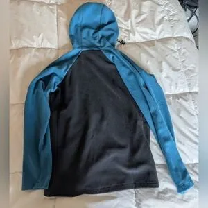 Never worn Melanzana Womens size small wind pro hoodie. Base is a dark navy/warm black color and the sleeves and hood are a bright blue. From a smoke free and pet free home.