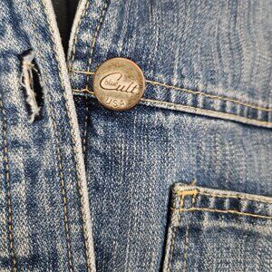 Item Specifics: This vintage denim chore jacket has a button front closure with attached belt. It has long sleeves, side slits, and 4 front pockets with a fitted style. Material does not stretch.