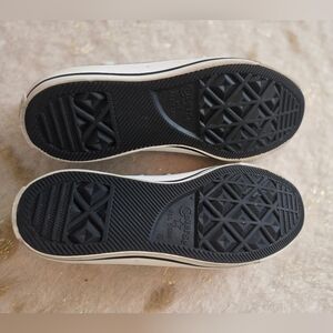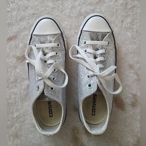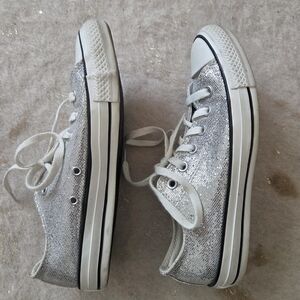 Stylish Converse sneakers with a glittery silver finish. Features classic white laces and toe cap. Perfect for casual wear.
