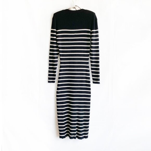 Cozy McKenna ribbed sweater dress has long sleeves, v-neck, white pearlized buttons, and fitted silhouette. Black with white stripes.