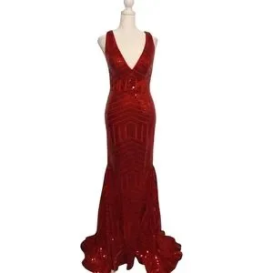 Glamorous Red Sequin Shiny V-Neck Mermaid Maxi Dress