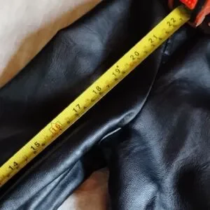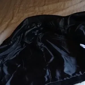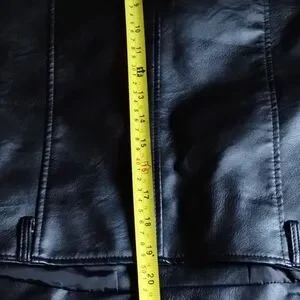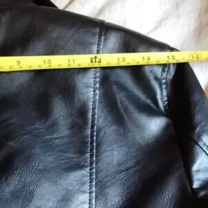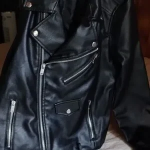 Chic black faux leather jacket. Features asymmetrical zipper and stylish pockets. Ideal for a bold look.