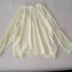 Chic light yellow blouse with subtle stripes. Features a front pocket and button-down design. Perfect for casual outings. Has pleat on back to make it even more flowy.