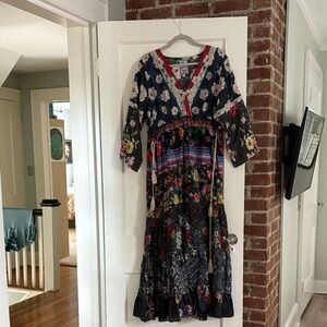 Chic black dress with floral design. Features a V-neck and long sleeves. Ideal for versatile styling.