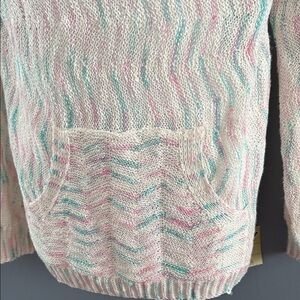 Cozy knit sweater with chevron pattern. Features pastel colors and a front pocket. Hooded with drawstring detail.