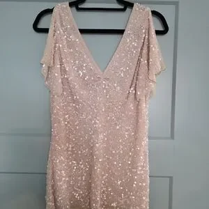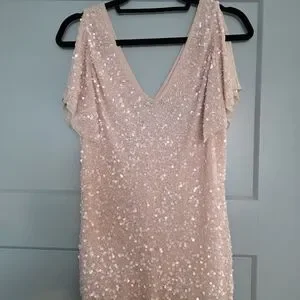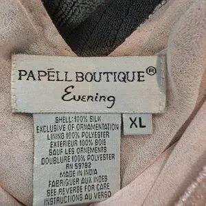 Features: This stunning Papell Boutique top is perfect for a special occasion. The delicate blush pink silk shell is fully embellished with sparkling sequins and intricate beading, creating a glamorous and elegant look. It features a flattering V-neckline and short, flutter-style sleeves. The lining is 100% polyester for comfort. Ideal for a wedding guest, cocktail party, or any formal event where you want to shine.