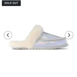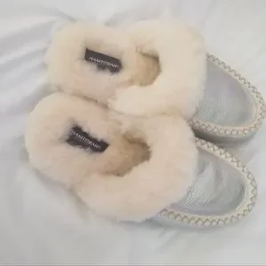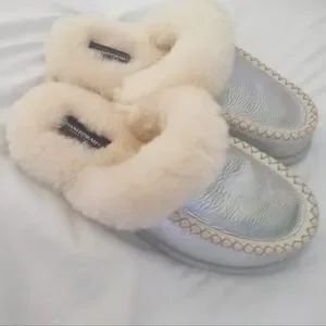 Warm and cozy slippers perfect for at the cottage or around the home use. Stylish iridescent look.