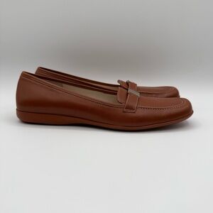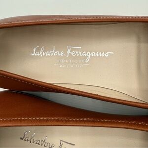Chic tan loafers by Salvatore Ferragamo. Sleek design with a classic touch. Ideal for versatile styling.