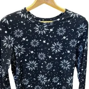 Celestial Sun Moon Stars Black Shirt Ribbed Top Whimsigoth Witchy Size XL