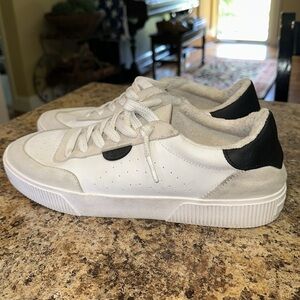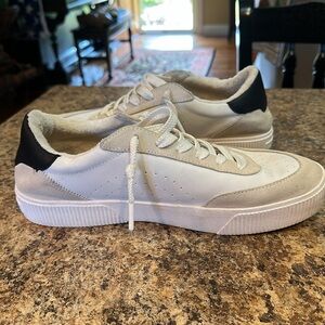 Sleek Reef sneakers with a white base and black accents. Ideal for casual outings. Good used condition. Some spots and could use a wipe up.