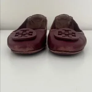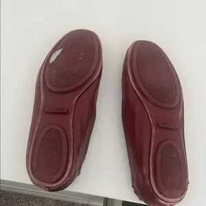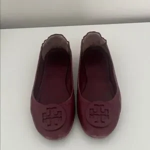 Elegant deep red flats with signature logo. Comfortable and stylish for any occasion.