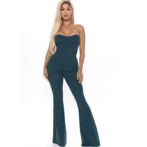 Teal co ord set featuring a strapless sweetheart top with high sides and matching wide leg flare pants