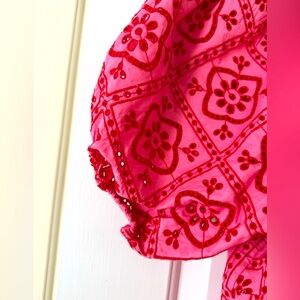 Step out in style with this elegant red/coral color crocheted eyelet patterned dress. Perfect for a dressy or casual occasion, this dress combines comfort and fashion effortlessly. Comfortable elastic at sleeves to give a slightly puffy look, flattering neckline.