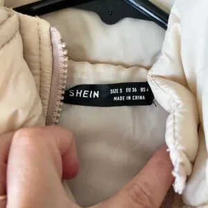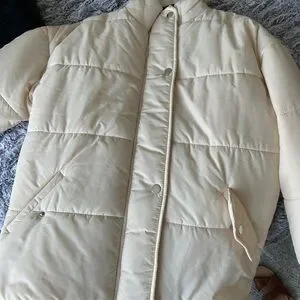 Stylish cream puffer jacket. Features a soft texture and comfortable fit. Button Down.