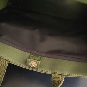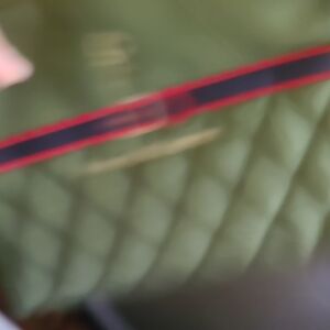 Elegant olive green tote with quilted design. Features a striking red accent and includes a matching pouchand removable base. Tote is L9" and W10".