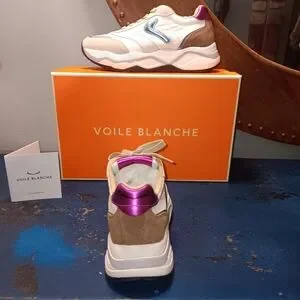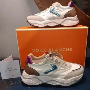 Step out in style with Voile Blanche women's sneakers. Featuring a chic white and blue design, these shoes offer both comfort and elegance for any occasion.